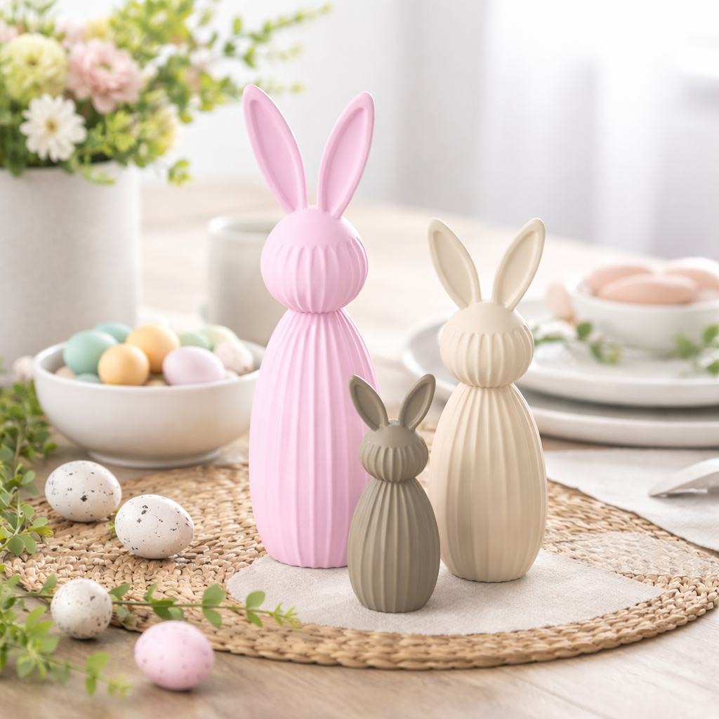 Ob auf dem Tisch, Sideboard, Regal oder als Osterdeko – die drei unterschiedlich großen Hasen sorgen sofort für eine harmonische und hochwertige Atmosphäre.