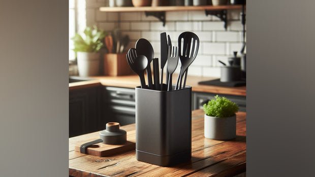With its generous capacity, the "MonoBlock" offers ample space for wooden spoons, spatulas, tongs, and more – upright and always within easy reach. Thanks to its sturdy base and well-designed design, it stands securely and non-slip on any work surface.